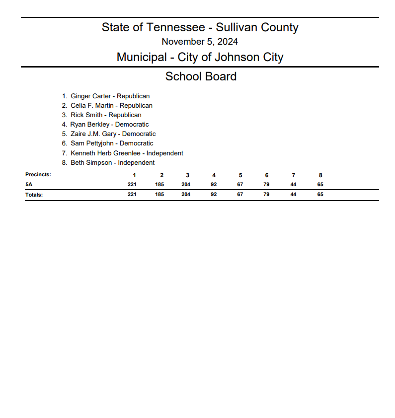 November 5, 2024 – General Election – Sullivan County – City School Board Report